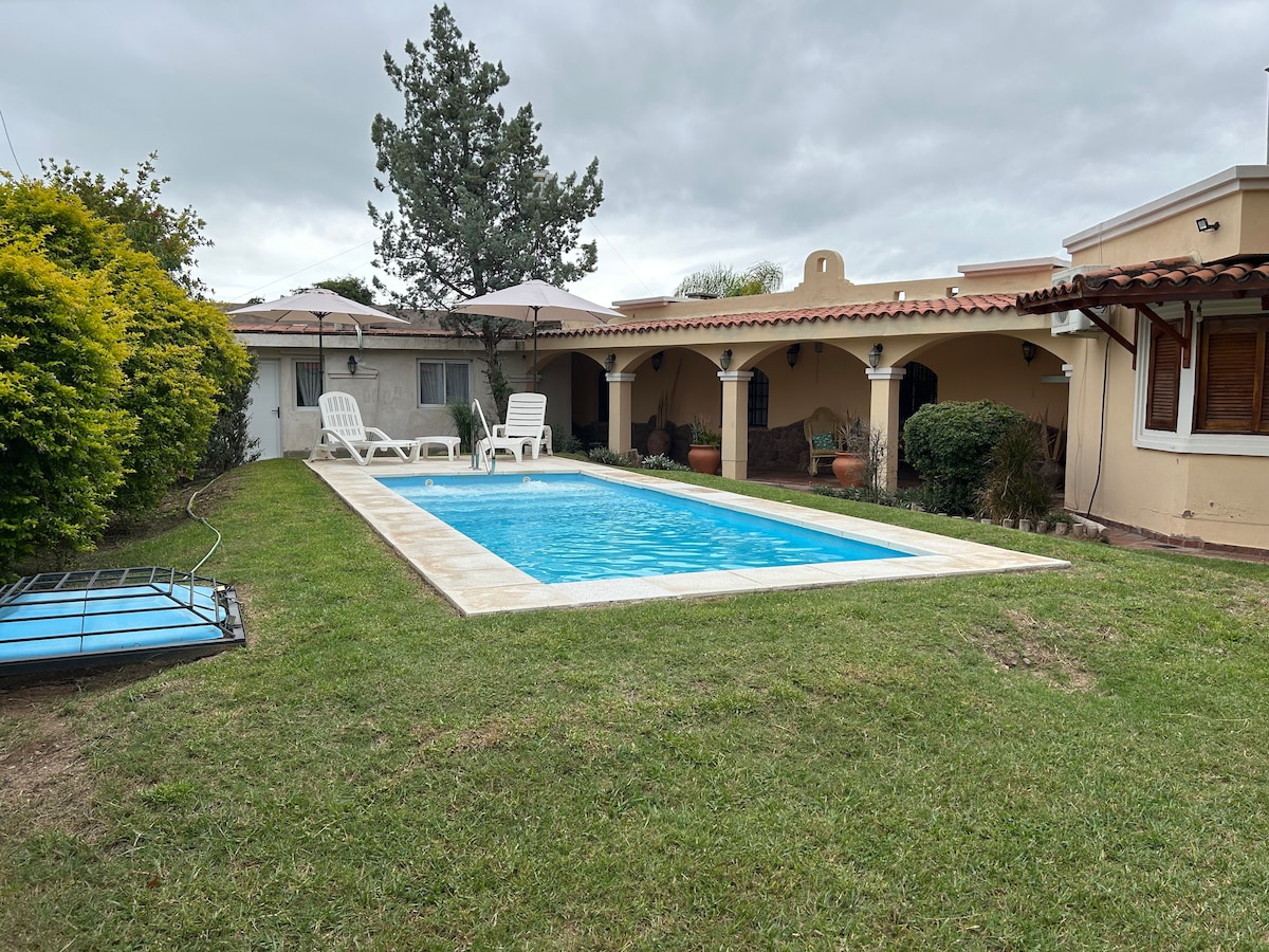 Este alojamiento con estilo es perfecto para viajes en grupo familiar. Servicio wi-fi gratuito Equipado con Tv satelital, Parque y jardín de 1200 m2, Galería de estar, Garajes privados para 6 vehículos Quincho con asador y parrilla. Living estar. Amplio Comedor, Cocina con microondas, horno eléctrico, anafe, heladera con Freezer, juguera, multiprocesadora, dispenser de agua fría y caliente. PISCINA