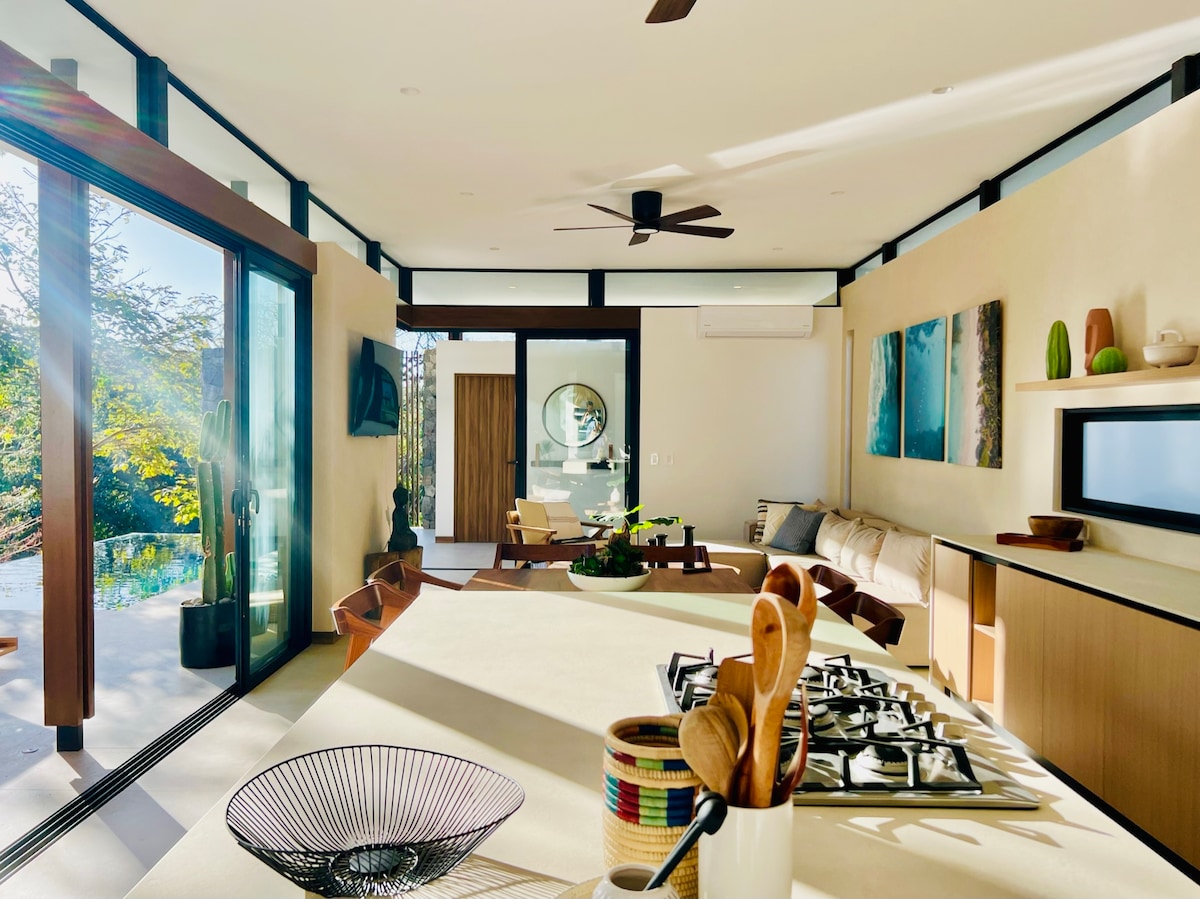 Casa Piñuelaは、海を望む貸切ヴィラで、周囲を囲むデッキとプールがあり、タマリンドビーチとアベジャナスビーチから20分の場所にあります。この魅力的な家には、キングサイズのベッド、居心地の良いリビングルーム、設備の整ったキッチン、専用のワークスペース、バスタブ付きの美しい屋外シャワーが備わっています。快適さとプライバシーを重視したデザインで、カップルやデジタルノマドに最適です。100%コットンのリネン、ステンレス製の調理器具、無害なバス用品や清掃用品など、細部までこだわっています。