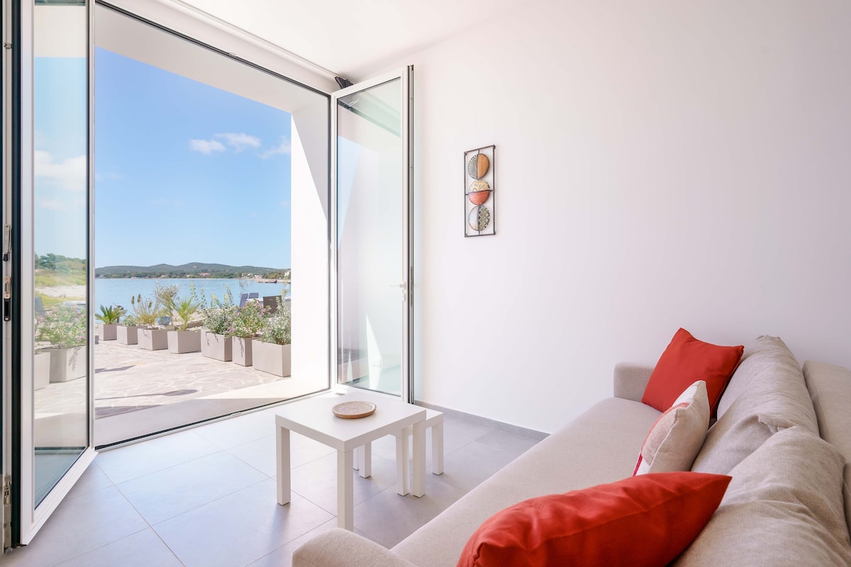 フェリー乗り場とビーチへの道に近い、海岸沿いの建物の1階にある40平方メートルの中央アパート。あらゆる設備が整っており、カップルや1〜2人のお子様連れのご家族に最適です。広々としたベッドルームには、ダブルベッドとソファベッドが備わっています。周辺に駐車場があり、必要なサービスやショップがすべて徒歩圏内にあります。