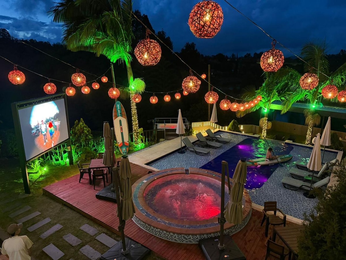 山腹のカントリーハウスは、果樹に囲まれた12人までのグループに最適で、滝やプールがわずか数メートル先に小川があります。 この宿泊施設には、卓球台、プール/ビリヤードテーブル、設備の整ったキッチン、季節限定のレストランサービス、さまざまなハンモックが備わっています。 Worlds Apart Eco - Hotelは、パラグライダー、ハイキング、キャニオニング、その他のアクティビティなど、さまざまなアウトドアツアーで、メデジンからわずか1時間の休憩とつながりを断ち切るのに理想的な場所です。