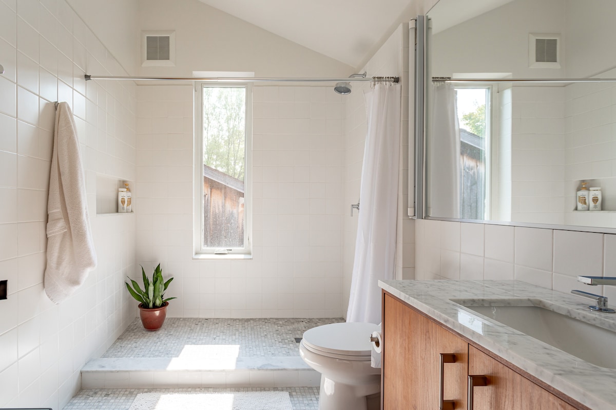 Blue Cabin is a cozy, design-forward retreat between the Capital Region and the Berkshires. Enjoy vaulted wood ceilings, a forest-green kitchen, and a spa-style bath. Outside, unwind in the covered lounge with U-shaped sectional, charcoal grill, and TV—or explore the backyard, where a creek runs through and a seasonal flower garden blooms. Peaceful, private, and perfectly located for both rest and adventure.