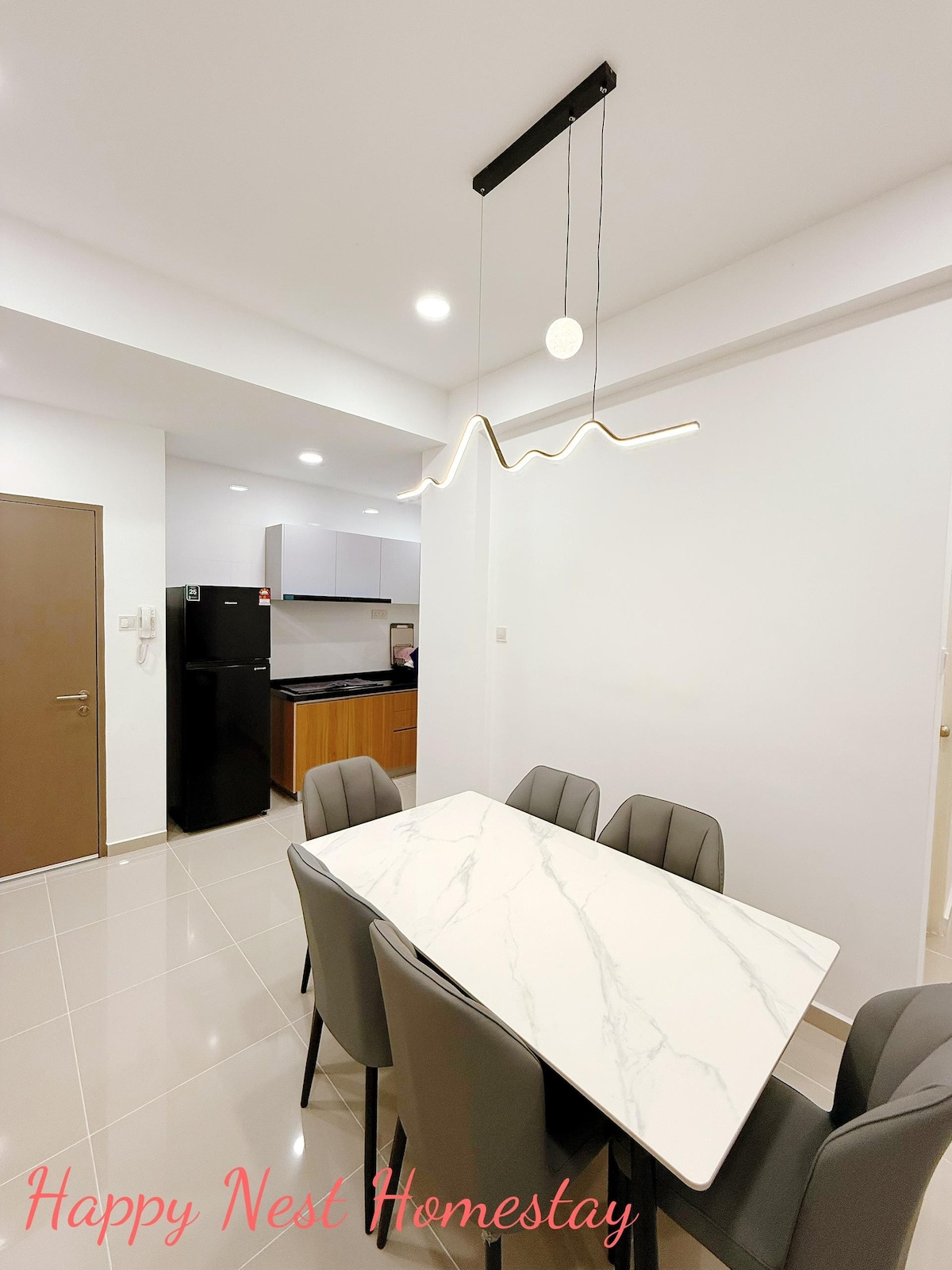 落ち着いたニュートラルカラーに包まれた現代的なアパートは、休暇中に求めるリラックスした雰囲気を提供します。明るくアースカラーに囲まれ、マレーシアのサイチョウを描いた壁画が、リビングエリアの主なアクセントとなっています。この広々としたホームステイには、無制限のWi-Fiが提供され、家具が揃っています。