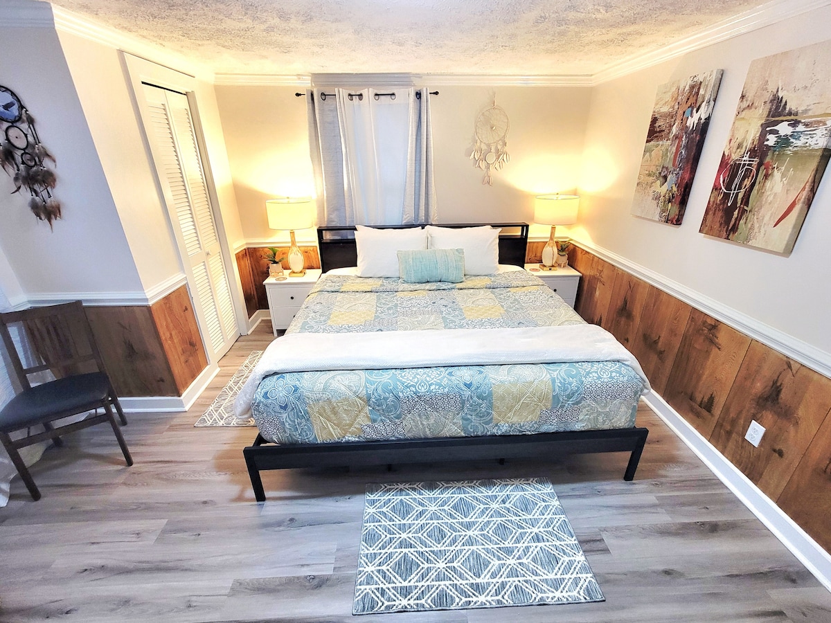 オールドブルーのリトリートは、ノースカロライナ州パインハースト&サザンパインズから数分です。熱帯低気圧「シャンタル」の被害により湖は一時的に水が引かれていますが、広大な景色、豊富な野生生物、思い出に残る夕日など、静かで魅力的な宿泊施設です。コテージには魅力的な家具が備わっており、寝室3部屋、バスルーム2部屋、フルキッチン、広々としたリビングエリア、サンルームがあります。サウナ、ファイヤーピット、プライベートドックをお楽しみください。ゴルフ、食事、ショッピングにも簡単にアクセスできます。