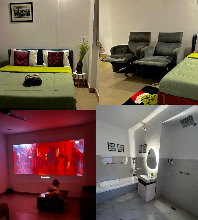 Experience a cozy private cinema stay featuring a projector screen, comfortable recliners, and a relaxing bathtub for the perfect unwind. Ideal for movie nights, romantic stays, or a peaceful getaway with a touch of luxury and comfort. Enjoy your favorite films while relaxing in a stylish space designed for comfort and entertainment. lift not functional right now.
