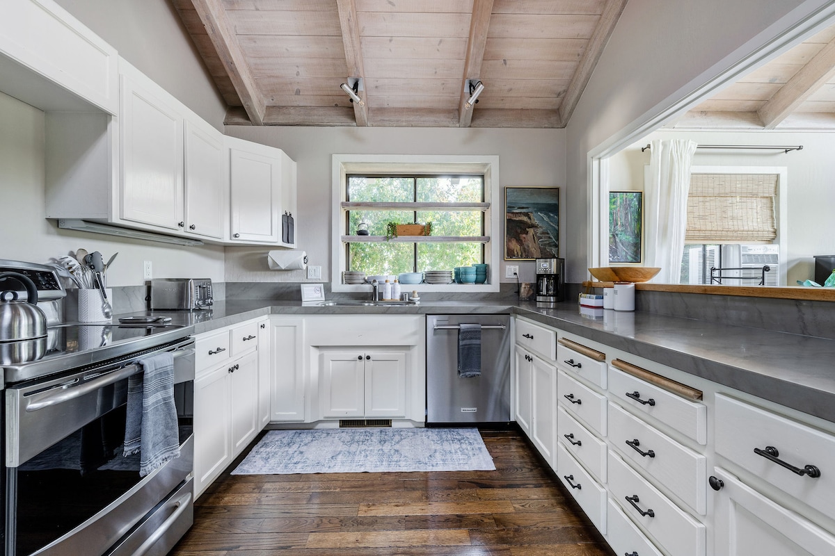 許可証番号:171035『Sunset Magazine』が「シックな隠れ家」と評したこの穏やかなツリーハウススタイルの隠れ家は、ミッドセンチュリーのデザインと木や石などの天然素材を融合させ、落ち着いた聖域のような雰囲気を醸し出しています。高くそびえる木製の梁の下では、床から天井までの大きな窓から光が差し込み、和風のドアが建築様式の魅力をさらに高めています。海を望む高木の上に建つこの宿泊施設には、高架デッキが3つあり、そのうちの1つにはハンモックが備えられています。くつろぎながら、周囲の樹冠を楽しむのに最適です。