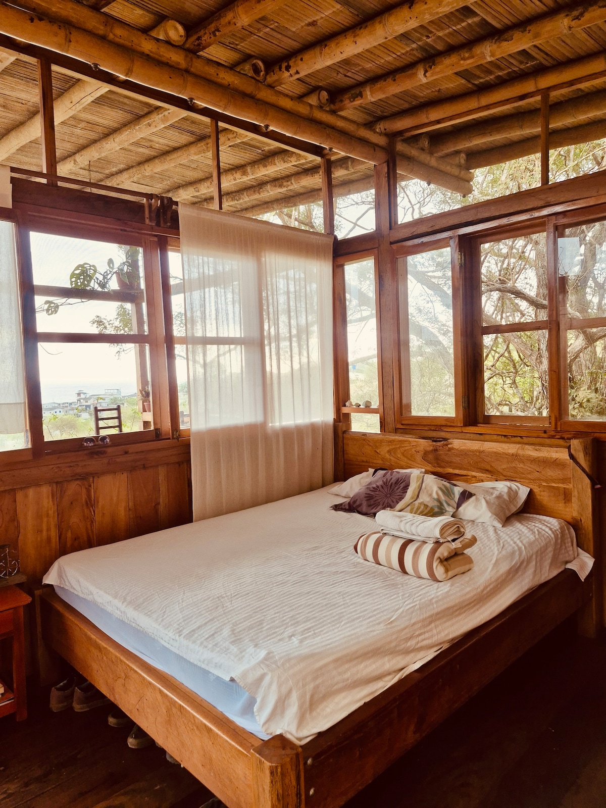 天然素材で作られたこのキャビンは、森林保護区の端にある丘の上に位置し、アヤンペビーチ(象徴的なアソルカドス島)と熱帯雨林の素晴らしいパノラマビューを提供します。 ここからは、澄んだ夜空に輝く星を眺め、遠くから轟音する海の音とともに眠り、熱帯の鳥のさえずりで目を覚まし、赤道太平洋が提供する最高の夕日を楽しむことができます。