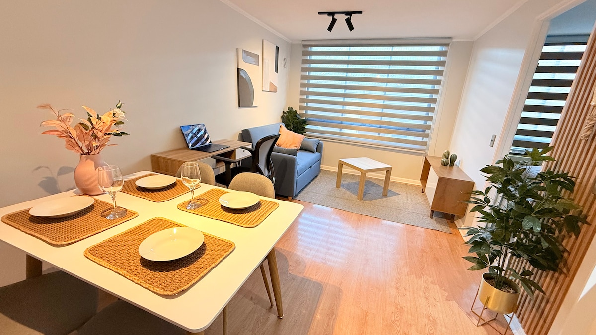 Ubicado en el corazón de Santiago, este departamento es perfecto tanto para turistas como para viajeros de trabajo. Disfruta de una vista despejada, excelente conexión al metro y WiFi rápido para home office o streaming. Espacio tranquilo, cama cómoda, cocina equipada y check-in digital. Todo lo que necesitas para explorar la ciudad o concentrarte en tus proyectos, con estilo y comodidad.