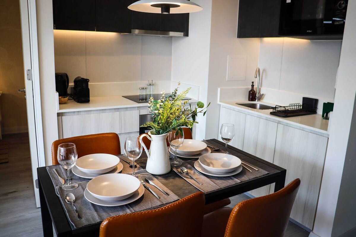 ニュニョアの洗練された1D/1Bアパートメントは、2名様に最適で、3名様は布団でお休みいただけます。ヴィラ・フレイ地下鉄駅から徒歩圏内にあるこのスペースは、現代的なデザイン、設備の整ったキッチン、高速WiFi、スマートテレビ、高品質の寝具を提供しています。カフェ、公園、サービスに囲まれた、静かで交通の便の良いエリアにあります。スタイリッシュで快適な都会的な体験。