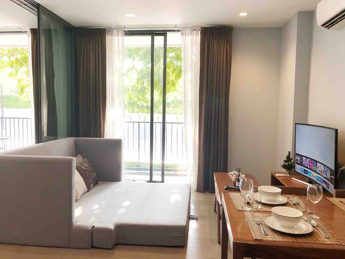 居心地の良いコンドミニアムへようこそ!寝室2室、小さなキッチンコーナー、洗濯やリラックスに最適なバルコニー2つを備えた広々とした場所です。ここでは観光客向けの値上げはありません。お手頃な価格で本物の地元体験を提供しています!近所のお店やレストランもすべて地元の価格なので、地元の人のように生活し、食事を楽しむことができます。フューチャーパーク、ドンムアン空港、大学からも近く、とても便利です。落ち着いて、本物の地元の雰囲気をお楽しみください!