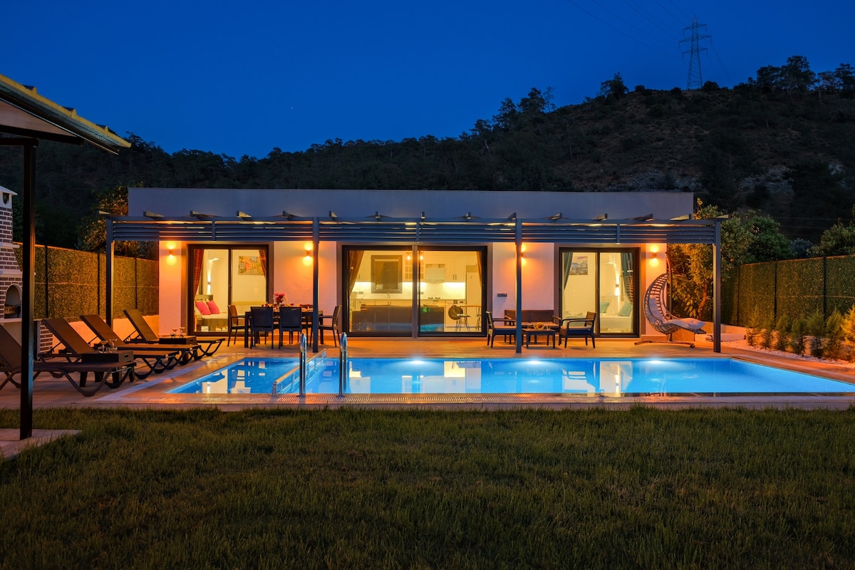 Best vacation home with unwinding in this modern villa very close to Kayacik Beach and to Dalaman airport both 7 mins by car .. The Entire villa at your service whether 4 or upto 6 person family friends .We are minutes away from the best Mediterranean beaches by car or daily boat rentals private or public ones .Great restaurants and natural outdoor mineral spa 's nearby .We got listings for you upon request . come enjoy mediterranean sea breeze pool villa.. Home away home with luxury