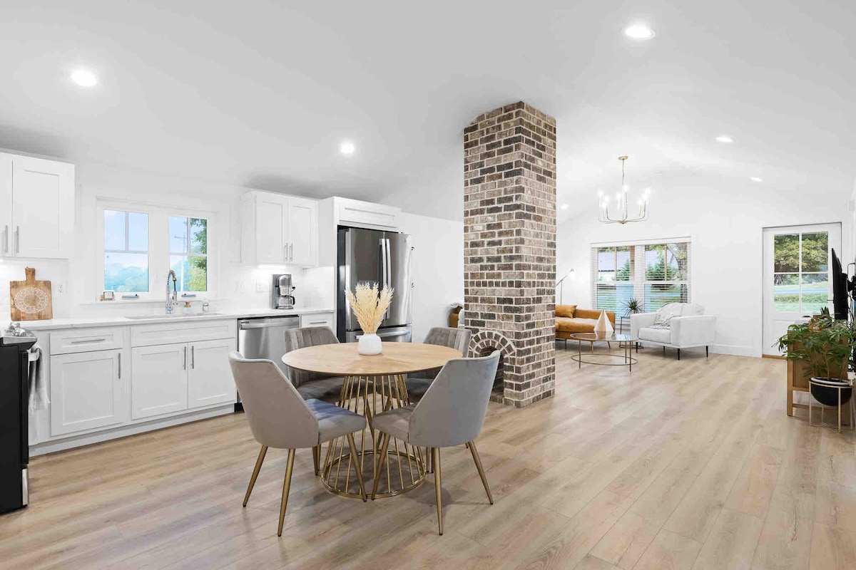 Newly remodeled 1950s Farmhouse, Complete with 3 bedrooms & 2 full bath. The perfect getaway from the City that comfortably sleeps 5 guest. Amazing view from the large covered back porch with access to 6 acres. Large tile shower in the master bedroom & deep soaking tub in the guest bath. All new appliances & access to washer/dryer. Enjoy all seasons on the covered porch with outdoor furniture and TV. Only 5 min from Howe Farms Venue & 22 min from Chatt airport. House does sit on a busy highway!