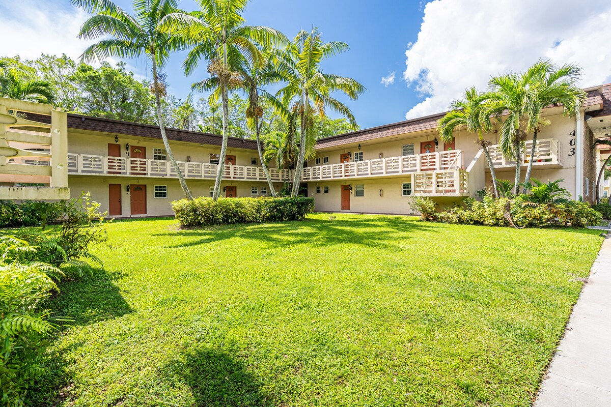 新しいキッチン、バスルーム、セントラルエアコンが備わった、完全に改装されたアパートです。 とても清潔です。クイーンサイズのベッド1台と引き出し式ソファ1台。 4kスマートテレビ2台、Youtube TV、Amazon Prime、Netflix、HBO Max、ESPN +、Hulu、Disney +付き。 ユニット内には無料の洗濯機と乾燥機があります。 無料駐車場。コマーシャルブルバード・ピアビーチとフォートローダーデールのダウンタウンから約10 ~15分です。 共有スペースには2つのガゼボ、6 ~8名様用のジャグジー、炭火バーベキュー、ゴルフパッティンググリーンがあります。 友達と過ごすのに理想的な場所です。