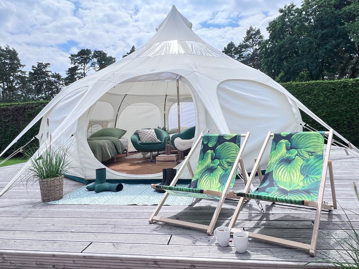 GLAMPING NUTHETALは、ポツダムとベルリンのすぐ近くにある、約1200m2の敷地に建てられた、特別なリトリートです。 敷地内には、3つのグランピングテントと、バスルームとキッチンを備えた2つの家があります。4人用の18m2の「スターライト」テントと、それぞれ2人用の2つの小さな3x3mテント(「サンセット」と「サンライズ」)があります。 10名様でご予約の場合は、追加のテントを1つ設置するか、または2名様が家でお休みいただくことができます。