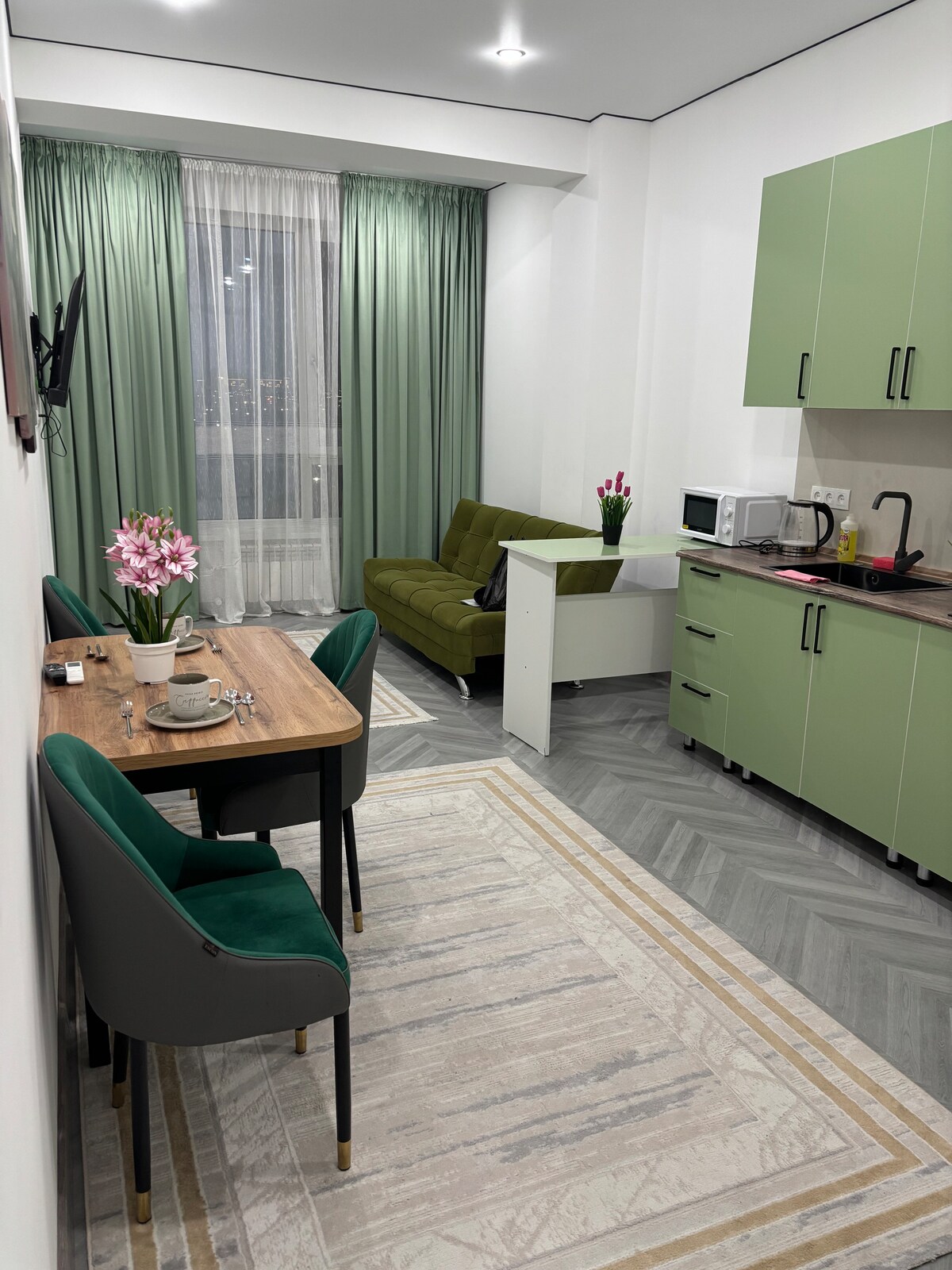 居心地の良い雰囲気と考え抜かれたインテリアのスタイリッシュなワンルームアパートメント。窓からは、特に朝と夕方に美しい街の素晴らしい景色が見えます。出張者にもカップルにも適しています。アパートは暖かく快適で、キッチン、Wi-Fi、忙しい1日の後にリラックスできる快適な場所など、必要なものはすべて揃っています。