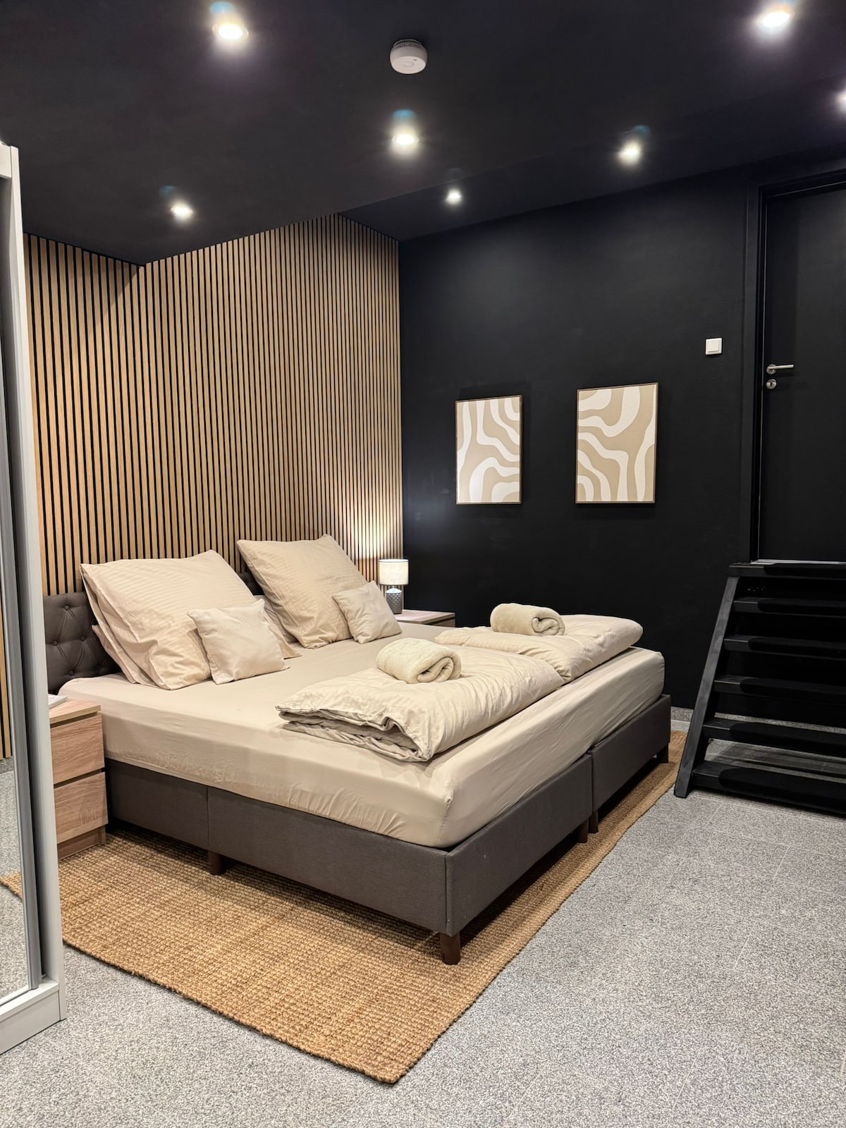 静かな一軒家の屋根裏にある80㎡のアパートは、2025年に新築され、デジタルのコンビネーションロックを使用した、非接触型の個別アクセスが可能です。設備が整っており、ダブルベッドの寝室、モダンなバスルーム、設備の整ったキッチンなど、最大4人まで宿泊できます。家の前に無料で駐車スペースをご利用いただけます。徒歩圏内(約900 m )には、ショッピング施設と公共交通機関があります。