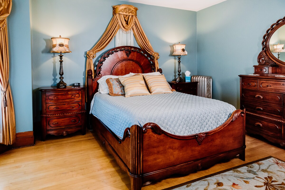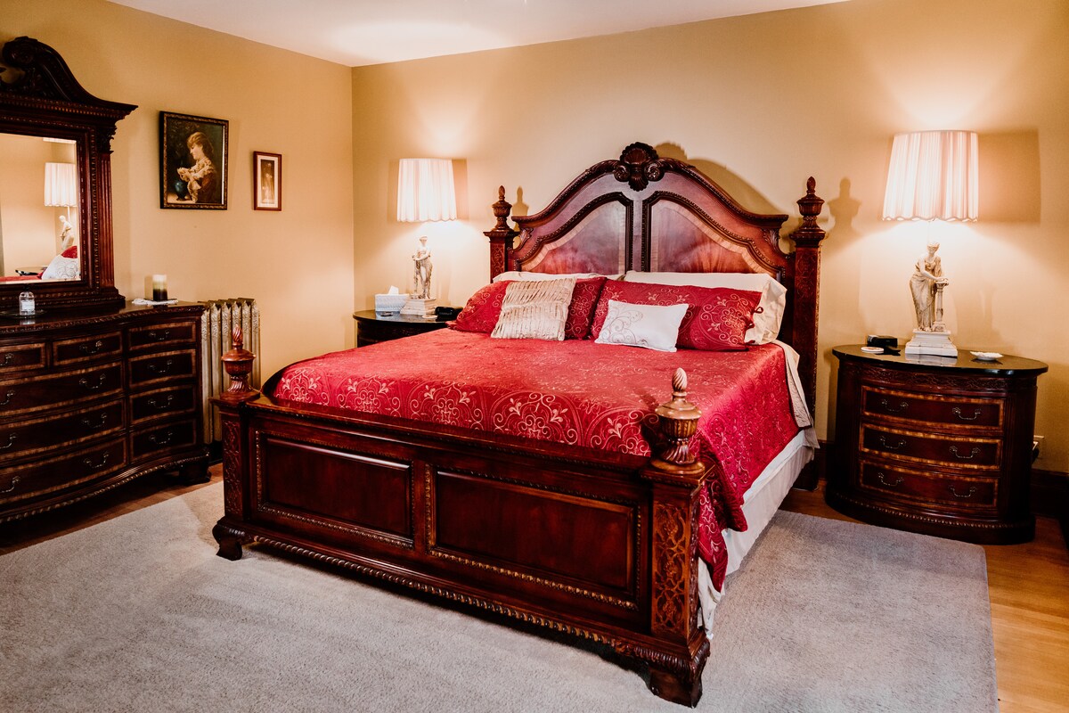 1897 Beekman House Bed and Breakfast is a beautifully restored Victorian manor. The house retains its original front porch, pocket doors, hardwood floors, high ceilings, stained glass windows, richly-toned woodwork, and grand staircase. Located in Central New York’s world-class wine region, our beautifully-appointed home, modern amenities and gracious hospitality will provide the perfect setting for your Finger Lakes vacation. The Empress Room is an exquisitely appointed room fit for a queen.