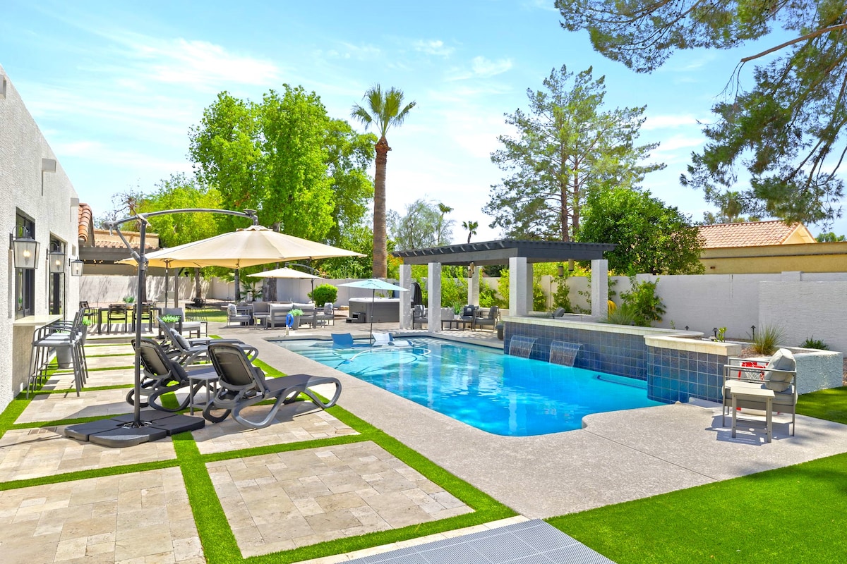 スコッツデールエリアの中心部にある静かなエリアにある、16人用の豪華な7ベッド、4.5バスルーム。レストラン、ナイトライフ、ハイキング、ゴルフコース、スパに近く、家族、カップル、男性/女性の旅行に最適です。セレブリティグリーンズのパッティンググリーン、温水プール、霧がかったパティオ、ファイヤーピット。アップグレードされたキッチン、ジム、ウェットバー付きゲームルーム、ビリヤード、ピンボール、ゴールデンティー、卓球。ベッド3台、バスルーム2つの改装されたカシータは、プライバシーとマルチファミリーグループに最適です。結婚式や同様のイベントは固く禁じられています。