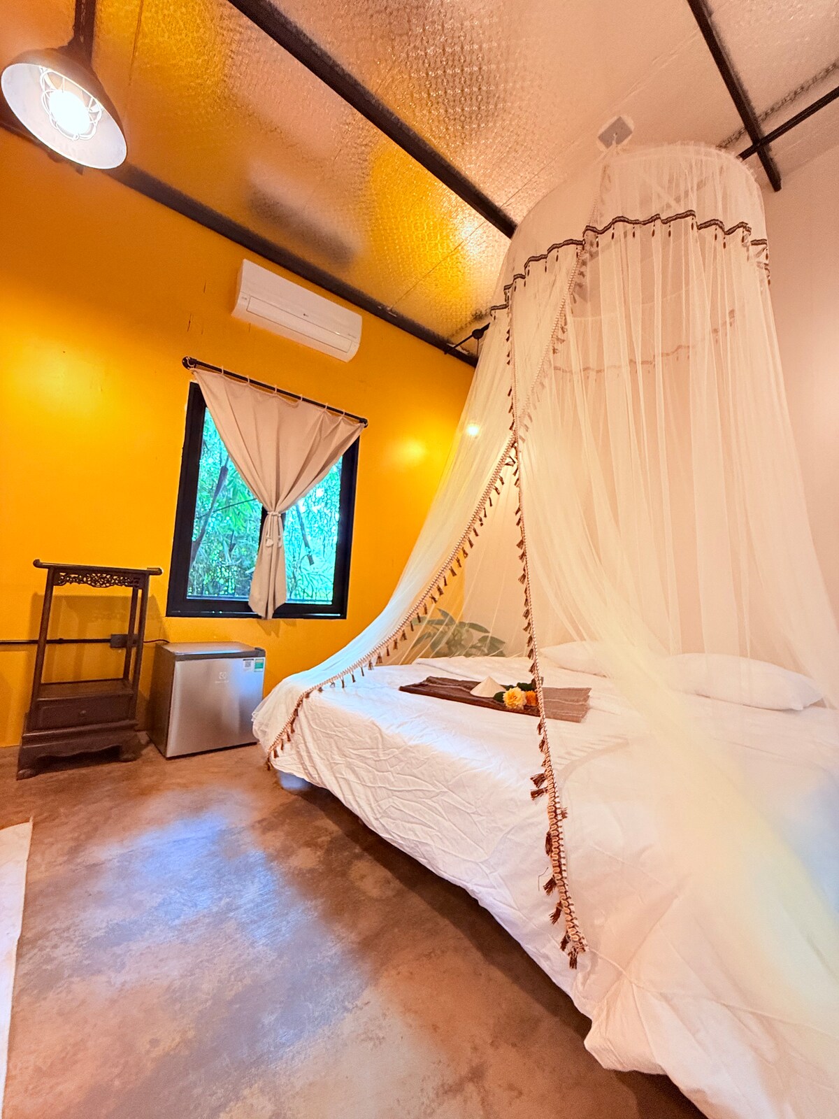 緑の木々に囲まれたGió Zen Balcony Loftは、暖かくミニマルなデザインの静かな休憩スペースです。自然光を取り入れる丸い窓、快適な大きなベッド、リラックスできる専用の高床式エリアが特徴のお部屋です。緑豊かな木々を見下ろす専用バルコニーは、朝のコーヒーを楽しむのに最適です。エアコン、スマートテレビ、WiFi、設備の整った専用バスルームを備えています。