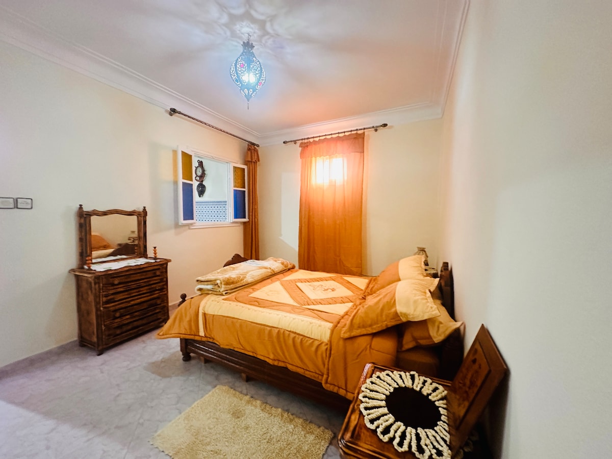 市内中心部の静かなエリアにある豪華な150平方メートルのアパートをご提供します。サフィゾーンのヴィラエリアにあり、美しいテラスからの眺めが素晴らしく、伝統的な噴水があり、花鉢に囲まれ、モロッコのタイルで飾られたダイニングテーブルがあり、素敵な時間を過ごし、太陽を浴びることができます。2つのベッドルーム、非常にモダンなリビングルーム、設備の整ったキッチン(コーヒーメーカー、コンロなど)、Wi-Fi接続、65インチテレビがあります。