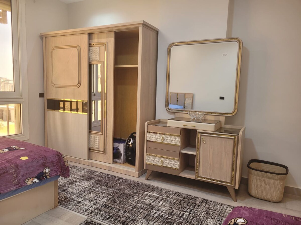 ニューカイロ中心部にある超近代的なAirbnbの宿泊先へようこそ! このスタイリッシュなフラットには、ベッド3台を備えた寝室が2部屋あり、最大4名様までご宿泊いただけます。 洗練されたバスルーム、設備の整ったオープンスタイルのキッチン、広々としたリビングとダイニングエリアをお楽しみください。 バルコニーに出れば、静かなエリアの景色が一望できます。 Garden 8やWater Way Mallの近くにあり、アル・リハブ・シティへのアクセスも簡単です。 ニューカイロで豪華さと利便性を体験しましょう! この活気に満ちた街での忘れられない思い出のために、今すぐ滞在先をご予約ください。