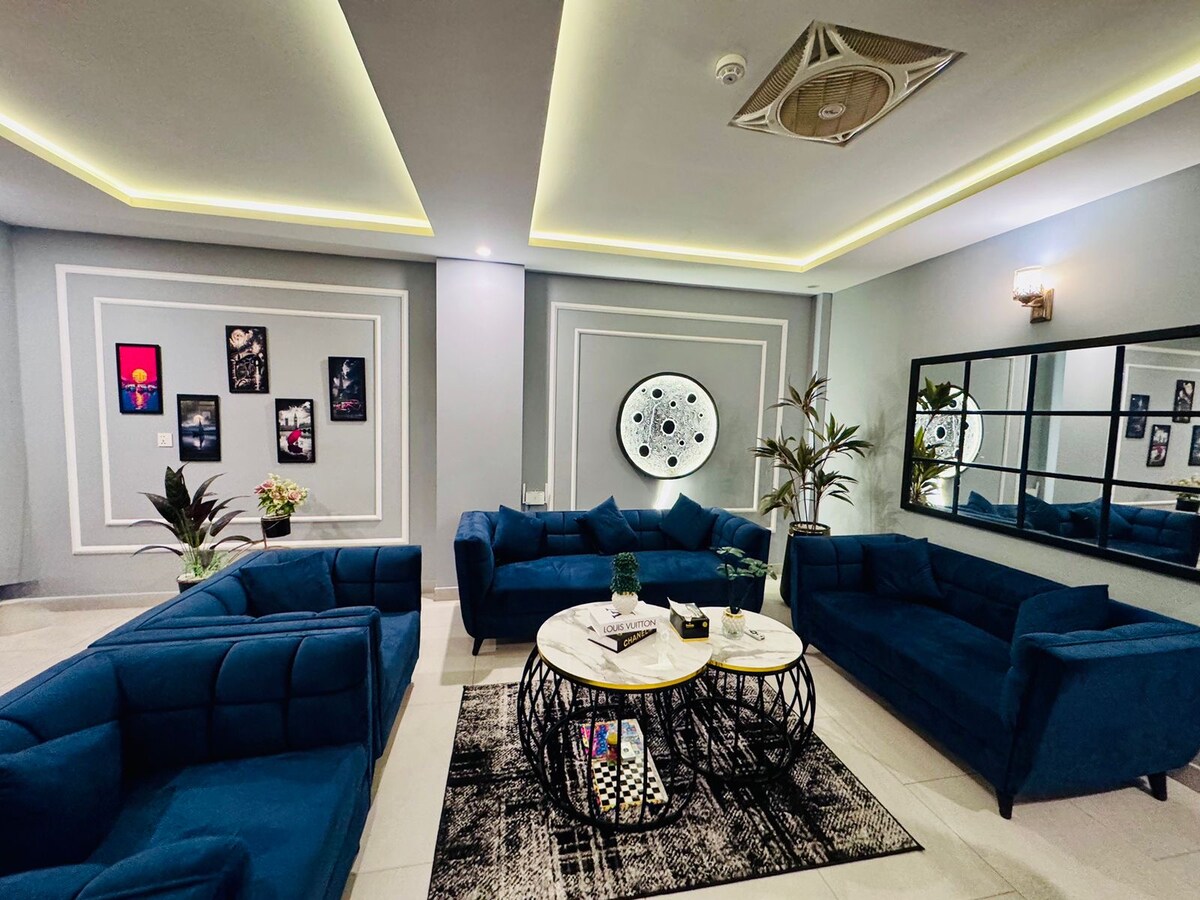 イスラマバード/ラワルピンディのバーリアタウンフェーズ8にあるデザイナーが装飾した1ベッドルームのアパートで、快適さとスタイリッシュさを体験してください。カップルやファミリーに最適で、キングサイズのベッド、エレガントなソファ、Netflix付きスマートテレビ、モダンなバスルームを備えています。5階のプレミアムな眺め、高速エレベーター、リラックスしたり楽しんだりするのに最適な居心地の良いリビングスペースをお楽しみください。
