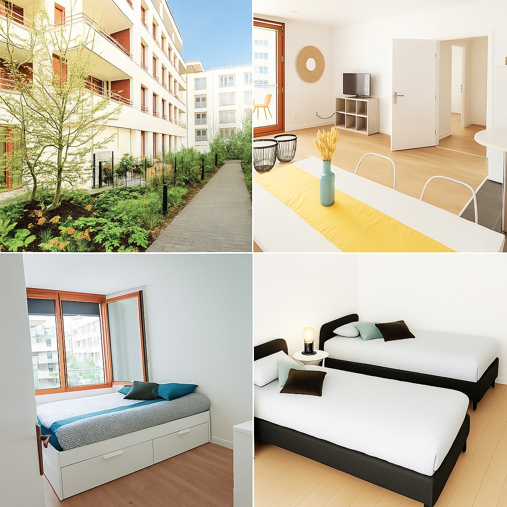 Ce logement contemporain, à quelques minutes de Paris, est situé dans une résidence récente (août 2024) avec un accès facile aux transports : bus, RER B/D "Stade de France", métro, et proche de nombreux commerces. D’une superficie de 69 m², il comprend 2 chambres, une terrasse avec vue sur jardin, et peut accueillir jusqu’à 7 personnes. Stationnement sécurisé dans l’immeuble. Internet rapide, linge fourni, inclus… Atout majeur : une terrasse sur le toit offrant une vue imprenable sur Paris.