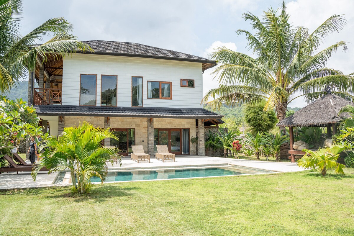 この専用の3ベッドルームヴィラは、専用のアクセスがある広くて静かな敷地内にあります。プール、ガゼボ、ガーデンスペース、ビリヤード台、フルキッチン、テレビ、ラウンジを備えた共用リビングエリアがあります。ジャグジー付きの専用バスルーム付きのお部屋は下の階にあります。2つの寝室と美しい景色を望む広々とした2階のラウンジは上の階にあります。すべてのお部屋には専用バスルーム、エアコン、ファン、衣類収納が備わっています。