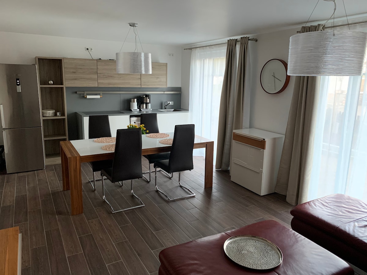 4棟6アパートメントの別荘施設内にある小さなメゾネットアパートメント。キッチンには、コンロ、電子レンジ、食器洗い機、トースター、電気ケトル、卵調理器、ドルチェグストコーヒーメーカー、最大6名様用の食器が完備されています。ベビーベッドとベビーチェアがあります。 地下室には洗濯機と乾燥機がありますが、これらはすべての住民が有料/コイン式で使用します。 駐車場があります。