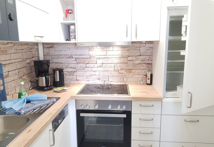 Kleine Maisonette-Ferienwohnung in einer Ferienanlage mit 4 Häusern à 6 Wohnungen. Die Küche ist voll ausgestattet mit Herd, Microwelle, Singlespülmaschine, Toaster, Wasser- und Eierkocher, einer Dolce-Gusto-Kaffeemaschine und Geschirr für bis zu 6 Personen. Ein Kinderreisebett und ein Kinderhochstuhl ist vorhanden. Eine Waschmaschine und ein Trockner ist im Keller vorhanden, diese werden jedoch von allen Bewohnern gegen Entgelt/Münzautomat genutzt. Ein Parkplatz ist vorhanden.