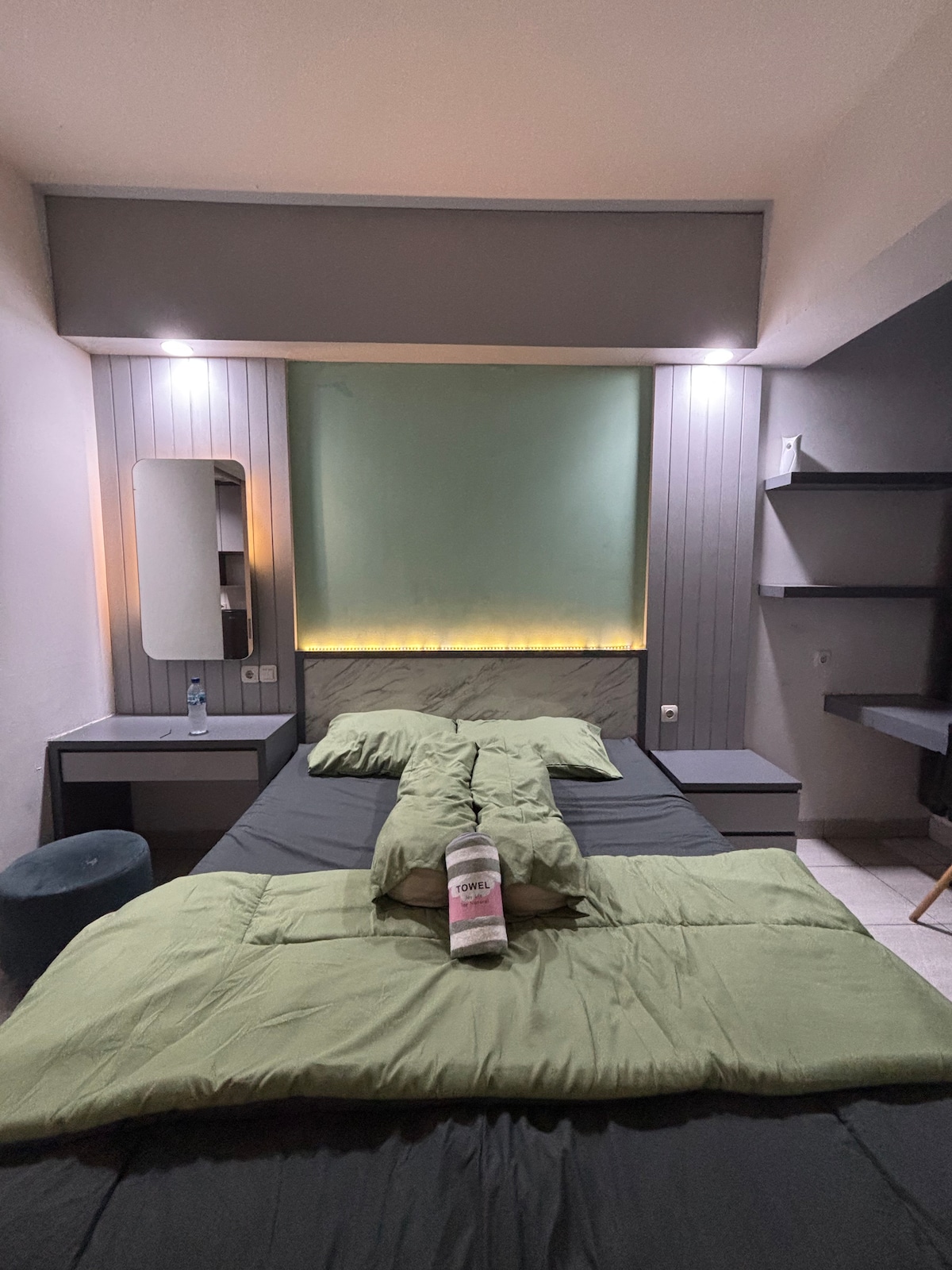 非常に戦略的な立地で、洪水の心配もありません。 大家族での宿泊に最適です。大きな部屋の大きさは5 x 3.5 = 15㎡です。 2つのバルコニー付きベッドルーム2室 2バスルーム 給湯器があります 大きくて快適なソファがあります。Netflix対応スマートテレビスプリングベッドサイズ180と160最大6名様までご宿泊いただけますとても高速なWi-Fiアンディップまでわずか5分屋台街、スーパーマーケット、ミニマーケットなどが近くにあります。 トランスマートモールまでわずか10分スーパーインドまで5分 交差点5まで20分 旧市街まで25分 空港まで30分
