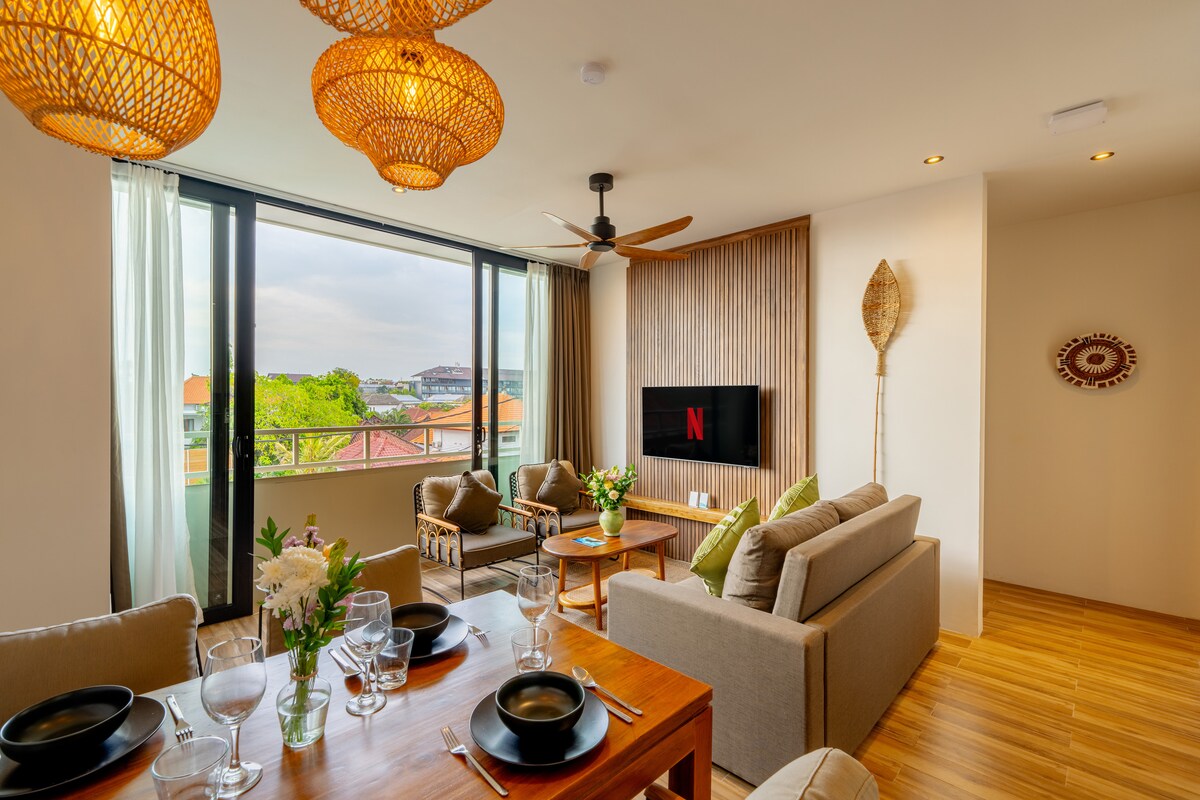 ラグジュアリーな2ベッドルームのアパート。スミニャックの中心部に位置し、ビーチから徒歩圏内にあります。この新築のアパートは、セキュリティ、スタイル、快適さを提供します。家族連れ、お友達、カップルに最適で、必需品を備えた考え抜かれたデザインが特徴です。ゲストは屋上プールとジムを独占的にご利用いただけます。ショップ、レストラン、アトラクションに近く、モダンな豪華さとバリの活気に満ちたエネルギーが完璧に融合し、完璧な休暇を過ごすことができます。