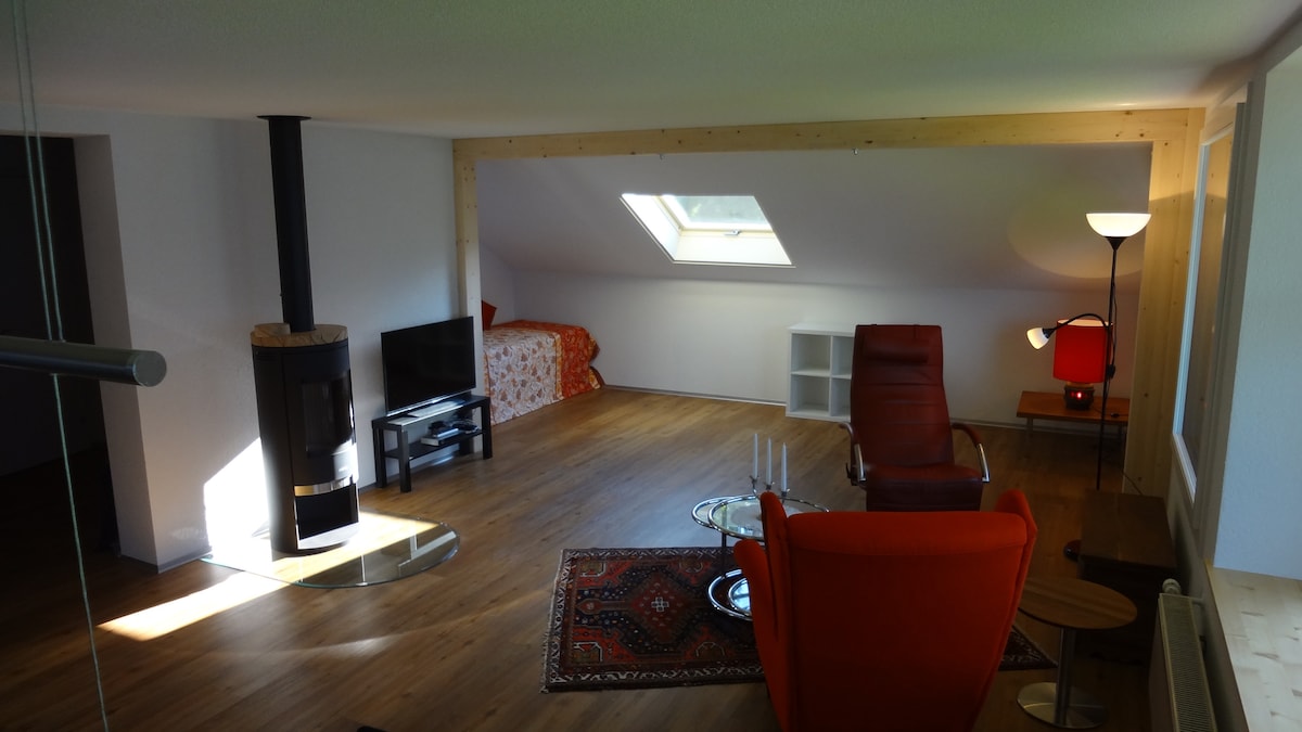 広々とした雰囲気の屋根裏アパートで、ブリエンツ湖の素晴らしい景色を眺めることができます。 周りはとても静かです。 湖に直接アクセスできます。 1 ~ 4名様に適しています。 1 ~ 2名様の指定料金。 アパートにもバスで行くことができます。