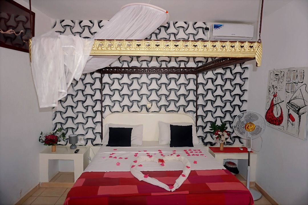 Offrez-vous une parenthèse au calme du domaine privé Amigo Bay, un immense parc fleuri et arboré, situé directement sur la plage très peu fréquentée de Cap Skirring. Dans cette chambre d'hôtel pour deux personnes avec terrasse, vous bénéficierez de tous les avantages d'un domaine entretenu et surveillé 24h/24. Accès direct à la plage par le grand jardin d'Amigo Bay. Piscine partagée avec bar extérieur.