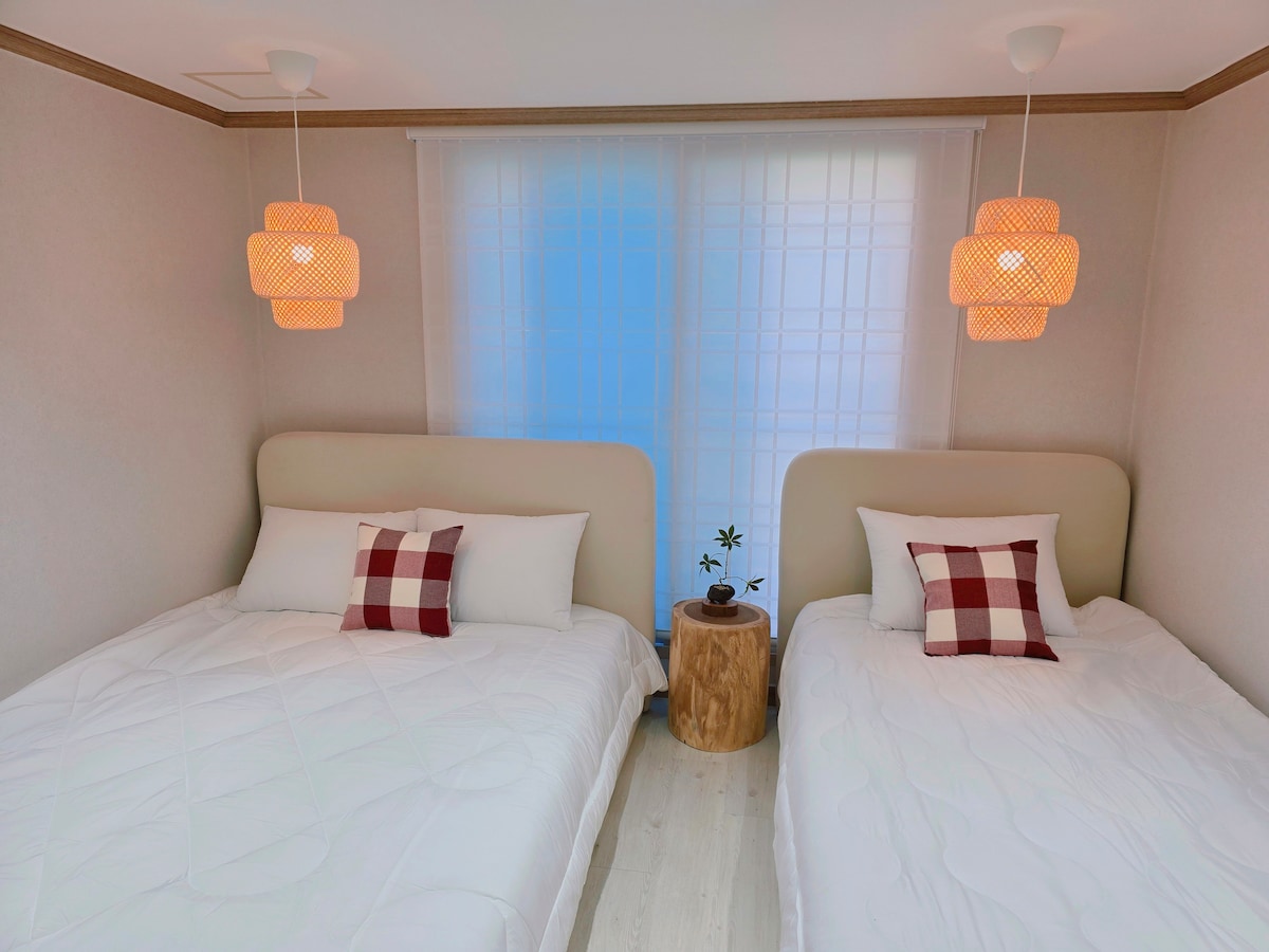 西面(全浦洞)にある宿泊施設です。 ベッド4台、バスルーム2室、リビングルーム1室(シャワー1つ) 電浦駅から徒歩5分 西面駅から徒歩10分 交通が良いです。 当宿泊施設での滞在をお楽しみいただければ幸いです。 当宿泊施設はエレベーターのない2階の宿泊施設です。 (エレベーターなしの上層階) 建物内駐車不可 近隣の有料駐車場をご利用ください 2階 部屋3、リビング1、トイレ2(1つのトイレは便器のみ) 3階には屋上テラスと屋根裏部屋があります。 屋上には電気グリル(30,000ウォン)が用意されています。 素敵なビームプロジェクターで思い出を作りましょう。