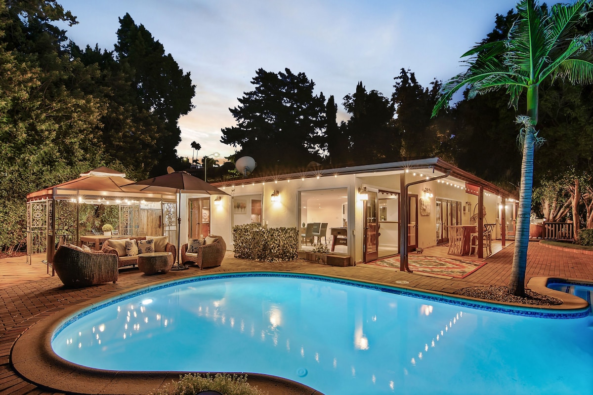 サンセット・パームズ・オアシスへようこそ。悪名高いサンセット・ストリップからわずか8分の静かな渓谷の住まいです。2階建ての高い天井が、この1950年代の建築的な隠れ家への劇的なエントランスを作り出しています。カリフォルニアの美しい自然の中で、2つの日当たりの良いパティオエリアをお楽しみください。アートと骨董品がたくさんあり、この壮大な家にはロサンゼルスの雰囲気が漂っています。この家は、かつてアリス・クーパー、ザ・モンキーズ、アル・パチーノなどのセレブが住んでいた歴史的なビバリーヒルズの通りにあります。