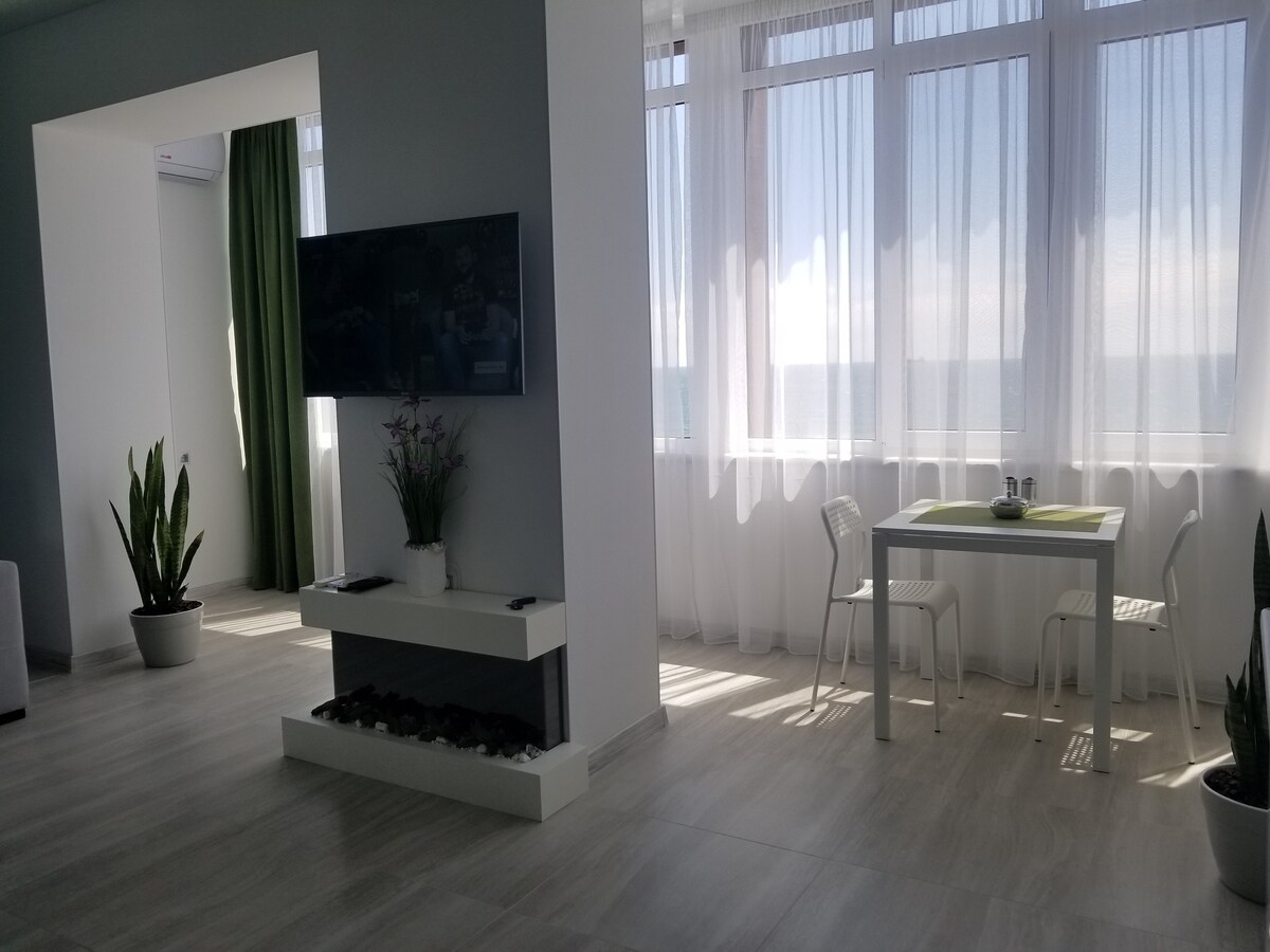 海から50メートル(ファーストライン)、ザトカ、カロリノ・ブガズのビーチにあるアパートホテルの快適でスタイリッシュな客室にご宿泊いただけます。客室はクラブリゾート「プロムナード」の8階にあります。客室には、冷蔵庫、テレビ、エアコン、Wi-Fi、大きなダブルベッド、専用バスルームなど、快適な滞在に必要なものがすべて揃っています。窓からは、左側に海、右側にウォーターパークとベルゴロド・ドネストロフスキー・エステュアリーの美しい景色が見えます。