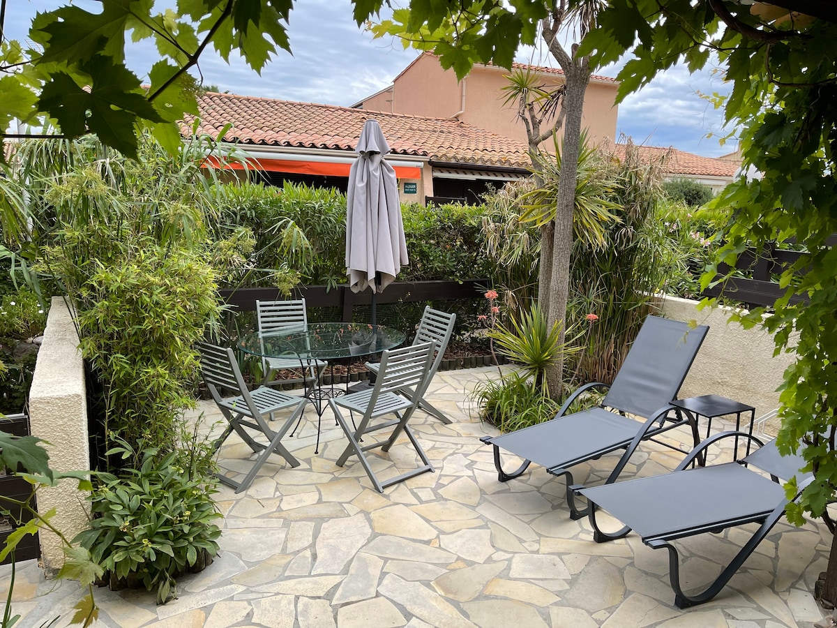 Pour voyageurs sans animaux uniquement. Village naturiste et centre international de tennis à moins de 10 min à pied, dans résidence fermée et sécurisée, villa au rdc, terrasse, parking privatif, refaite à neuf, 4 lits jumeaux. Equipée, planche, fer à repasser, coffre fort (pas de lave vaisselle, ni de lave linge). Linge de maison installé, ménage fait.