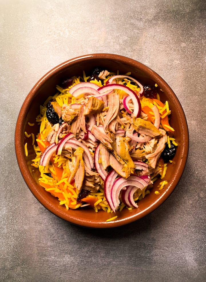 中央アジア風の香り豊かなライスボウル。柔らかくジューシーな肉(鶏肉またはラム肉をお選びください)を、サフランで染め上げたふんわりとした米に包み込みました。香り高いターメリックと温かみのあるスパイスが料理を引き立て、ドライフルーツのたっぷりのミックスが甘みと食感をプラスします。カラメル化した玉ネギで仕上げた、心地よいボウル料理。一口食べるたびに、風味豊かな肉、フルーティーな甘さ、香り高いスパイスのバランスが取れた組み合わせが楽しめます。