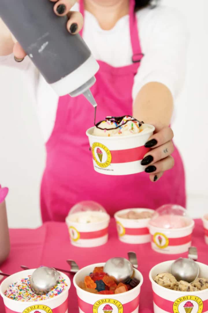 お客様の会場にライブアイスクリーム・ステーションを設置し、ゲストの皆様がお好みのフレーバーを選び、幅広く取り揃えた高級トッピングを使って自分だけのアイスクリームをカスタマイズできるようにします。すべて、冷凍された大理石の板の上でその場で作られます。