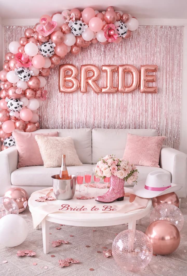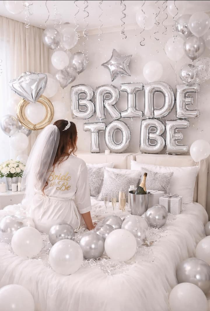 このオプションには、「花嫁」の風船、ティンセル/紙吹雪、花嫁用の帯、床に敷く風船が含まれます。