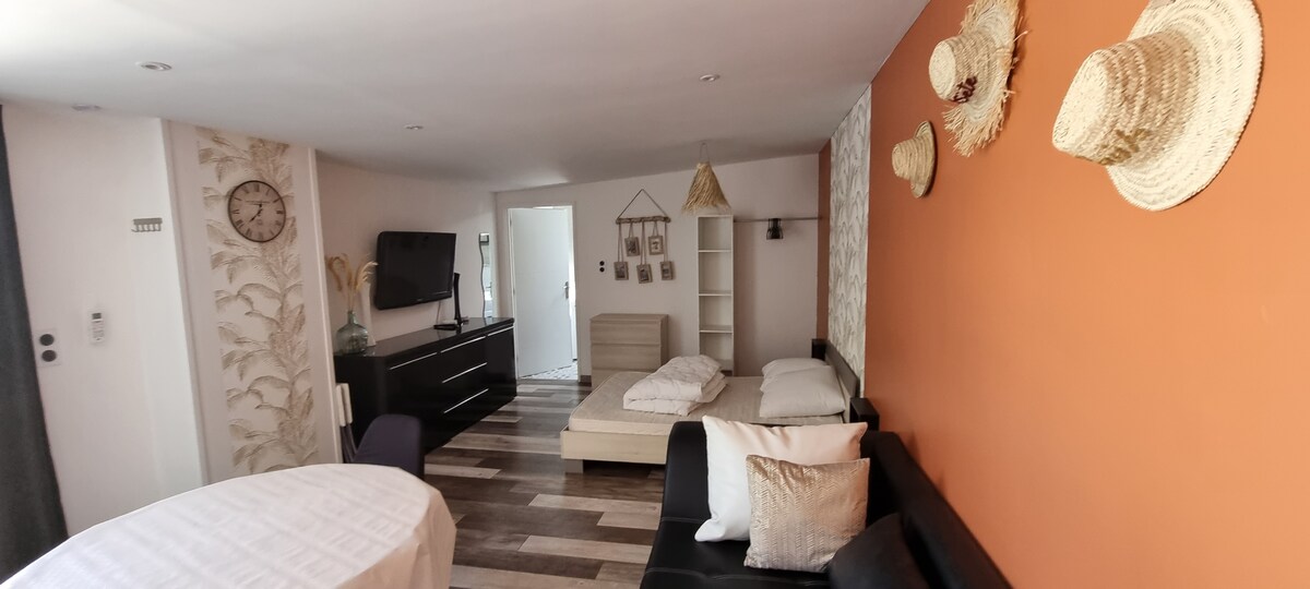 村の家の中の独立したワンルーム。 約20平方メートルの快適なワンルーム。 ベッド幅140cm、シャワールーム、新しく改装されたキッチン、コーヒーや読書などを楽しめる2つのアームチェアと低いテーブルがあるリラクゼーションエリアを提供しています。 アライニャンは、ペゼナスから8分、ベジエから20分、ビーチから20〜25分、高速道路から10分、モンペリエから45分の理想的な場所に位置する小さな町です。 村にはすべての設備があり、文化的に非常に活発です。