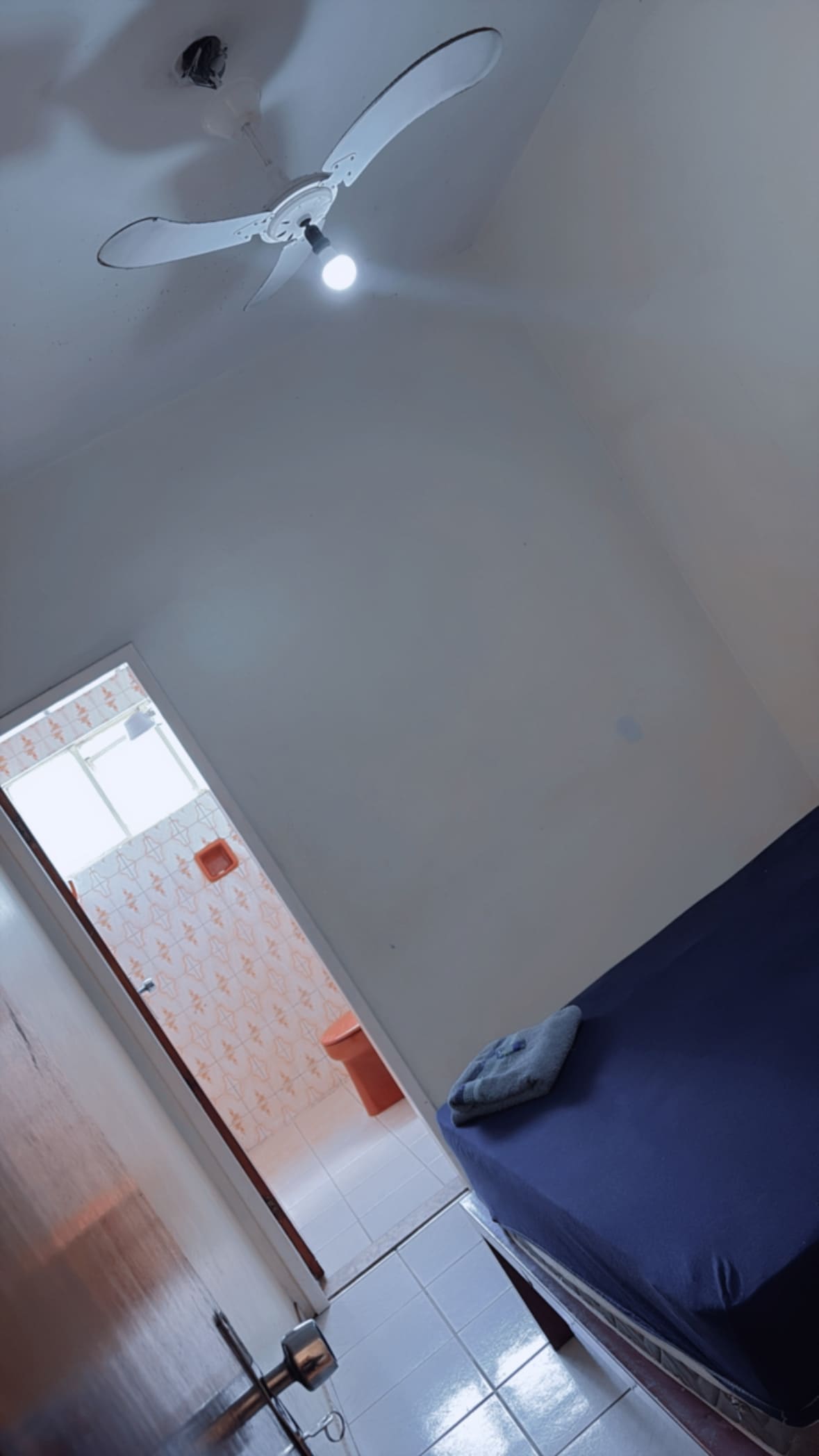apartamento com 1 cama de casal no ar condicionado e 2 cama de solteiro no ventilador de teto.