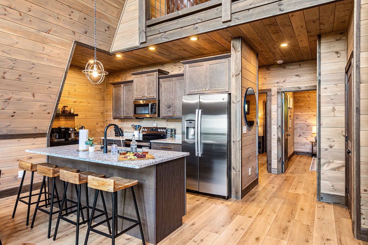 モダンで素朴な雰囲気 - レッドフォックスデンは、コブリーノブコミュニティにある新築のモダンスタイルのキャビンです。 - メインフロアにキングスイート、下の階にクイーンスイート2室があり、すべて専用バスルーム付き。 - メインリビング、マスターベッドルーム、ダイニングルームの天井は14フィート ガトリンバーグのダウンタウンからわずか13マイルの場所にあるこのコミュニティは、利便性とプライバシーの完璧なバランスを提供します。 - 便利なフラット、舗装された駐車場。素晴らしい景色