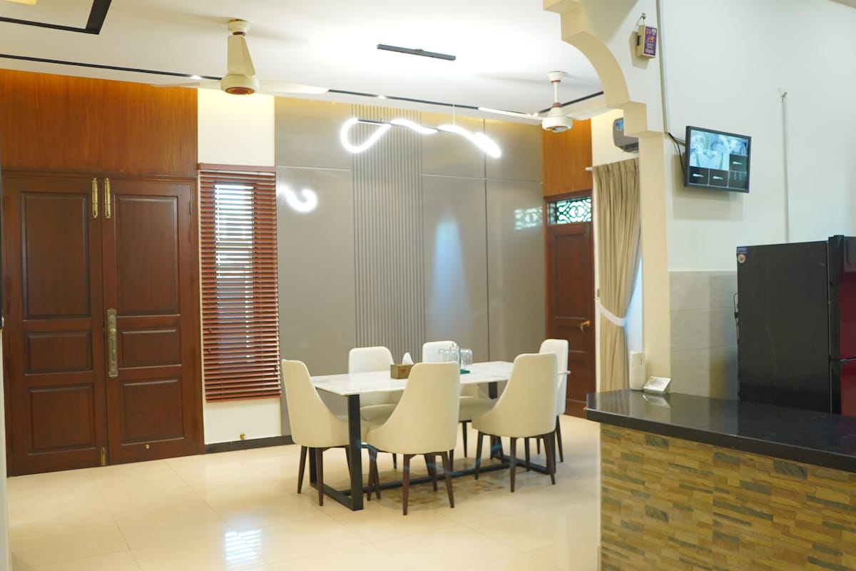 A Luxury Residenceへようこそ。ジンナ国際空港からわずか30分、ドルメン・モール・クリフトンとシービュー・ビーチからわずか10分の、DHAカラチの最高のロケーションにある、静かで一流のエリアにあるエレガントな新築のバンガローです。 この2階建てのバンガローは、最大8名様までご宿泊いただける快適でスタイリッシュな宿泊施設です。4つの寝室にはそれぞれモダンなアメニティ・設備が備わっており、贅沢で思い出に残る滞在をお楽しみいただけます。ご家族のみの予約を承ります。