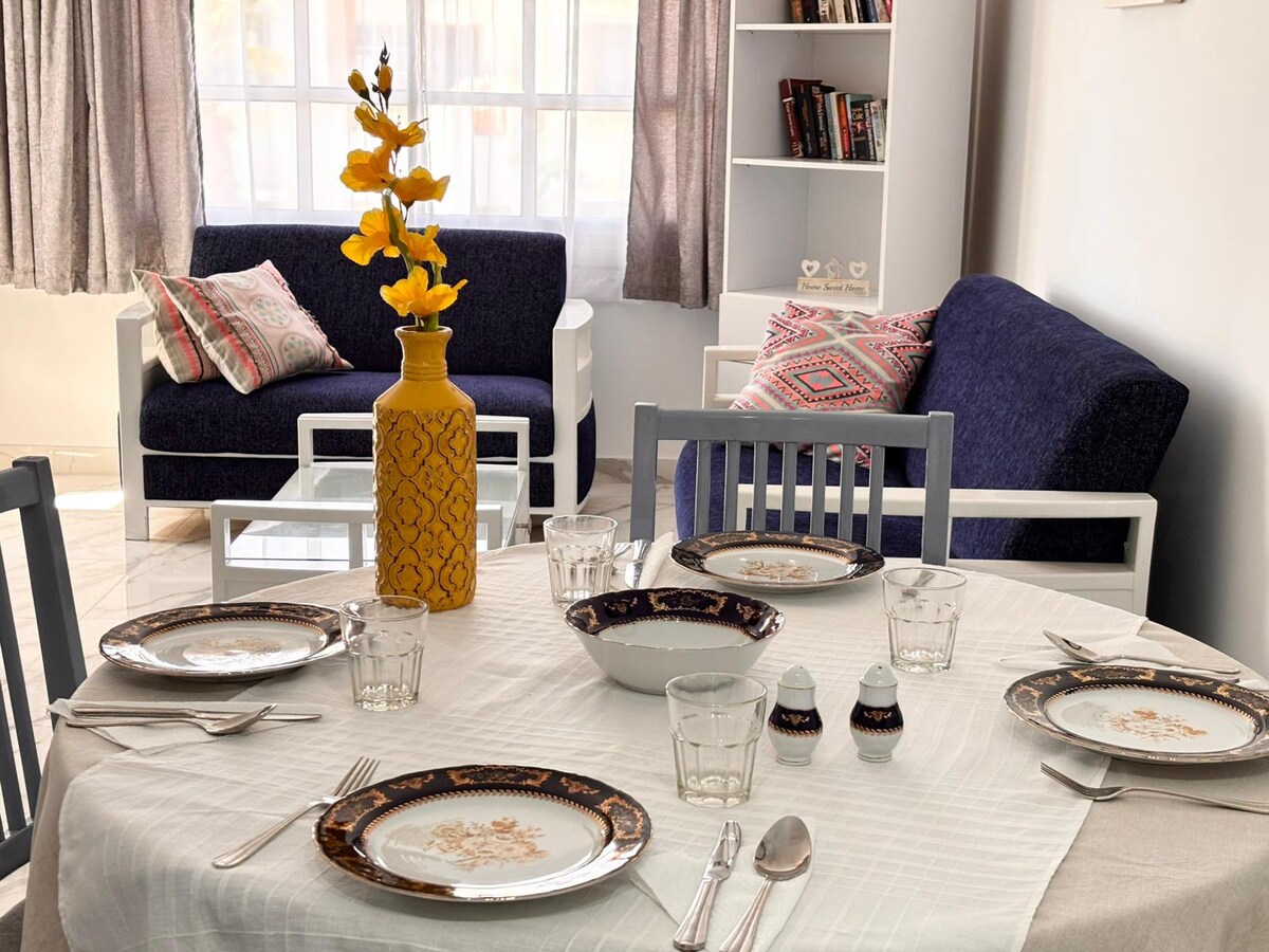 Kick back and relax in this coastal-style designed space! This stylish unit is fully quipped with everything you need for a perfect vacation and offers an adjacent private yard with a dining and smoking area. The space is located in the heart of Hadaba and is just a 2-minute walk from the sea, with plenty of restaurants, cafes, and 24-hour public and private transportation options nearby. You can also enjoy additional services such as a choice of breakfast, cleaning services, and bicycle rent.