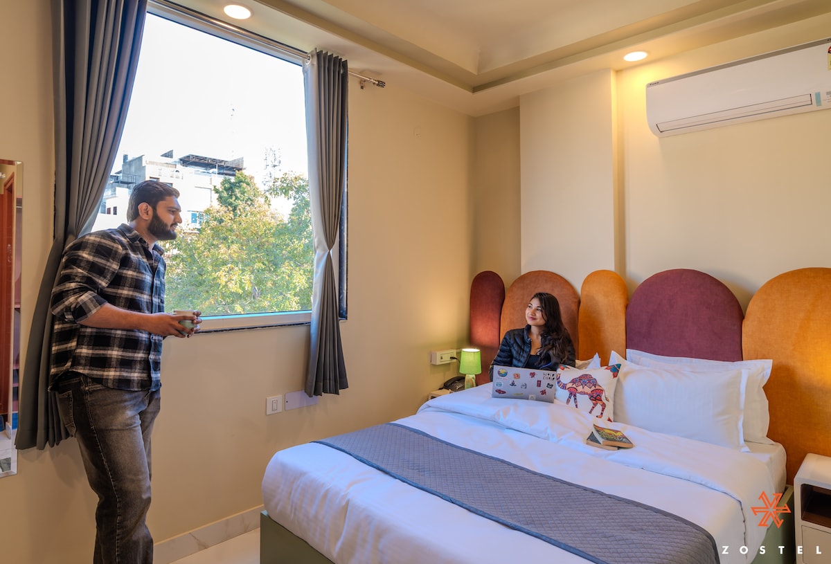 Get the much-needed rest away from the noise in this private room that comes with a queen-sized bed, an ensuite washroom, a TV, & an AC. Zostel Jaipur (MI Road) ends your search for the best place to stay in Jaipur. Here you can play terrace cricket, fuel up at our cafe with rooftop vibes, crash in dorms or chill in private rooms, and make new friends in the common room.