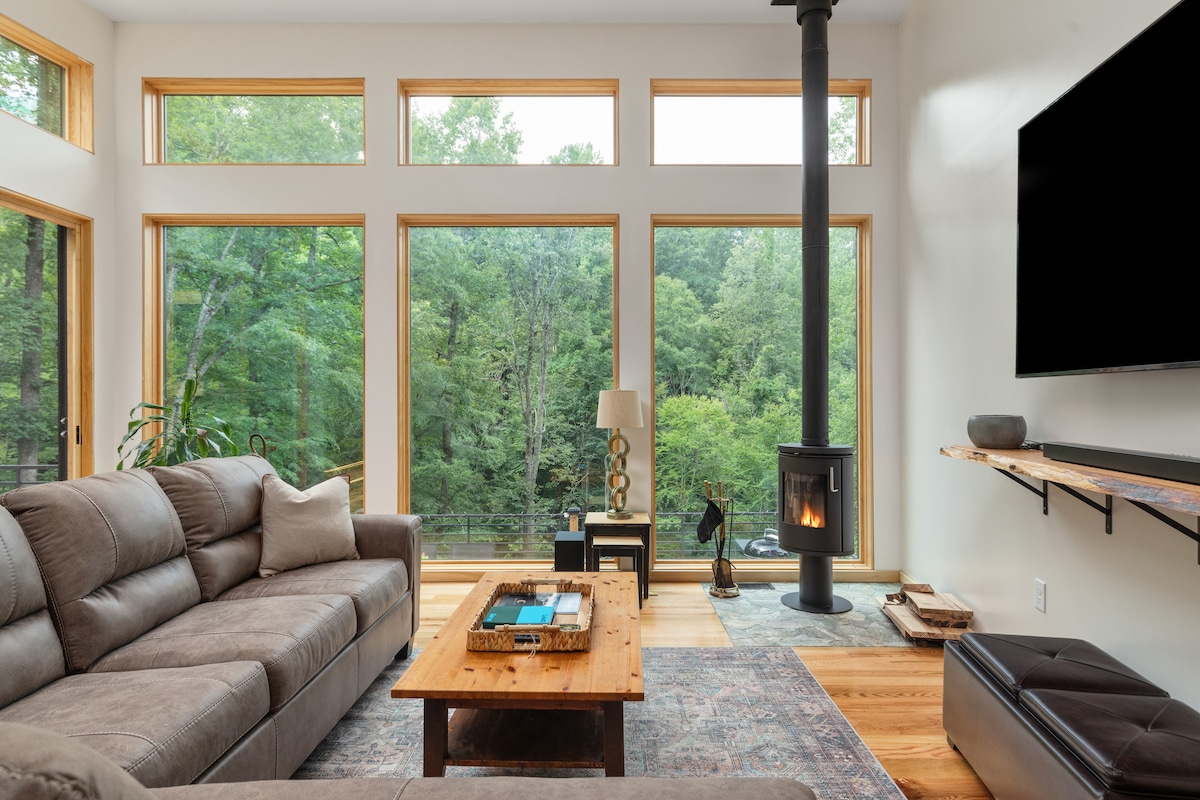 ワシントンDCから車で美しい景色を眺めながら行ける、バージニア州のシェナンドー・バレーにある新築の豪華な三角屋根の家「The Sparrow」に逃避行しましょう。アフリカ風のデザインが特徴のモダンな隠れ家には、2つの寝室、フルキッチン、暖炉、専用の露天風呂・ジャグジー、デッキ、仕事用スペース、4Kテレビ、PlayStation 5が備わっています。ルーレイ洞窟、スカイライン・ドライブ、シェナンドー国立公園から数分の場所にあり、思い出に残る冒険やリラクゼーションに最適な拠点です。
