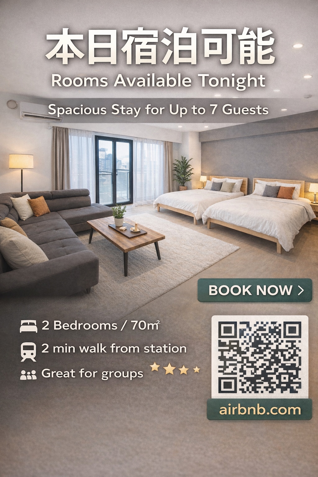 本日宿泊OK!駅徒歩2分の広々70㎡ステイ