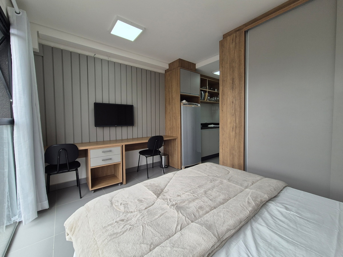 クリチバで思い出に残る体験をしていただくために、この魅力的な空間を作りました。 ジャルディンボタニコ公園の入り口に位置し、UFPRとFIEPの近くにあります。 2名様まで快適にご宿泊いただけます。 快適な環境には以下のものが含まれます。 - エアコン(冷暖房) - 寝室、リビング、キッチンが一体化 - キングサイズベッド - スマートテレビ - Wi-Fi - アイロン台/アイロン - ヘアドライヤー - ミニバー - 金庫 - シーツ、タオル、枕、毛布 - スタジオの隣にある囲地内の駐車スペース