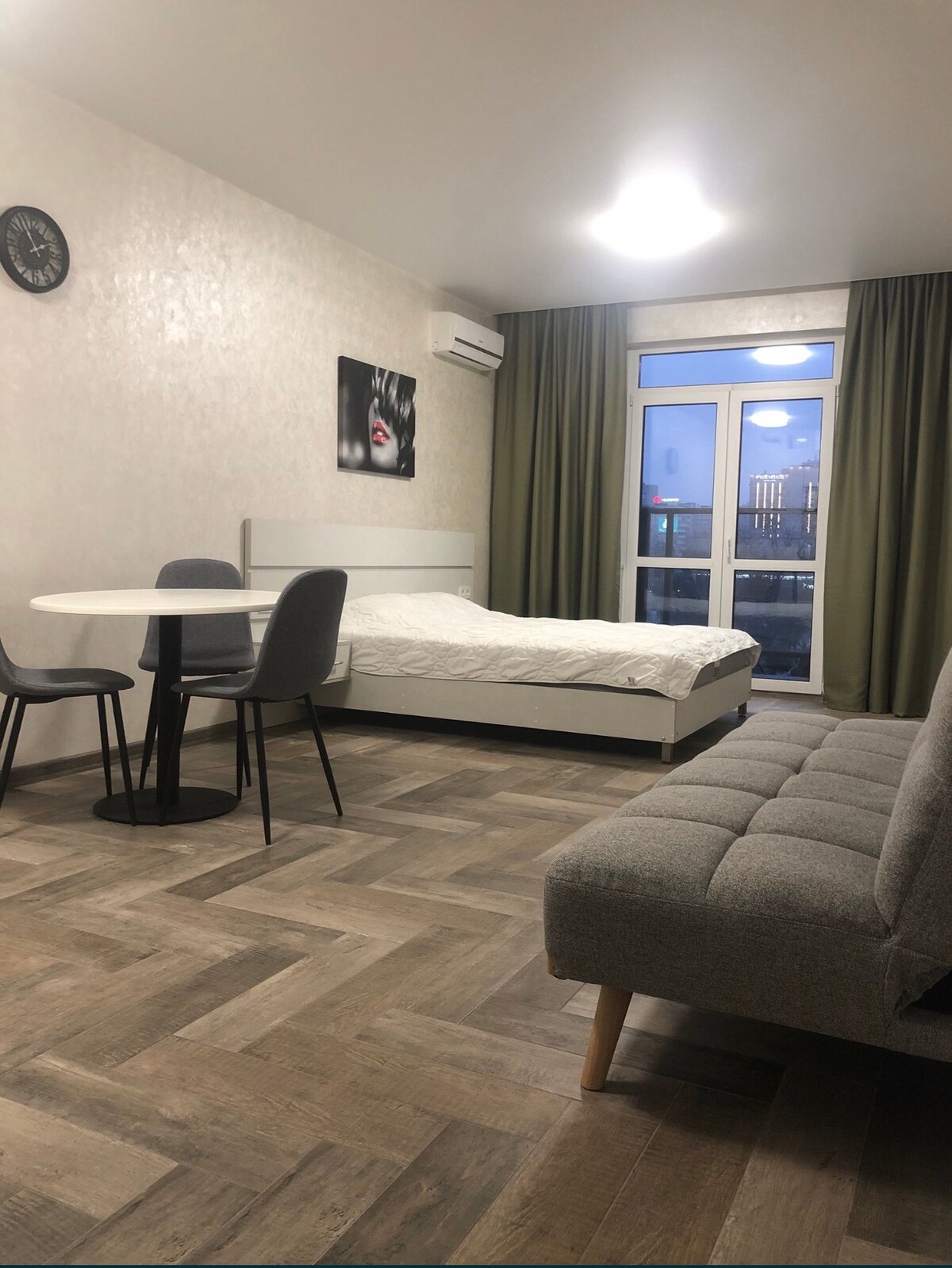 A cozy and modern hotel-type studio with elements of a loft style. The apartment is located on the 3nd floor. The building is located in the center of Kyiv near the shopping center "Gulliver", not far from the Olympic Stadium and Khreshchatyk Street, a 5-minute walk from the “Palace of Sports” metro station. The apartment has a king-size bed and, if it is necessary, an additional folding bed. The studio has a small kitchen, bathroom and toilet with everything you need, TV and Internet.